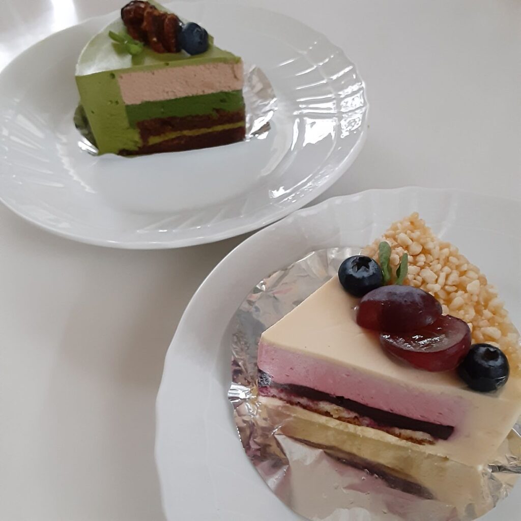 奥の「萌黄-もえぎ-」490円は、抹茶ムースに抹茶のパンナコッタ、ミルクチョコのムースに黒糖シロップのチョコスポンジが重なったケーキ。