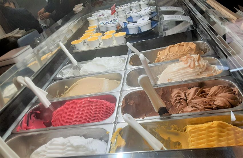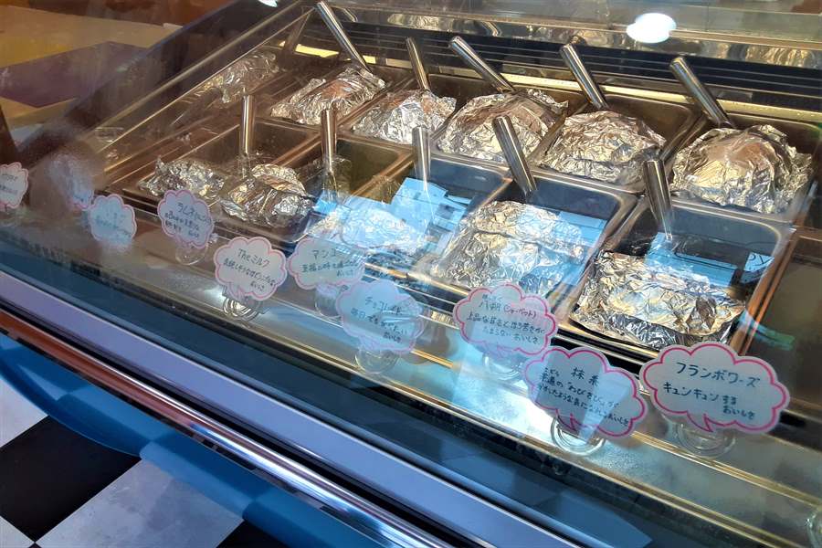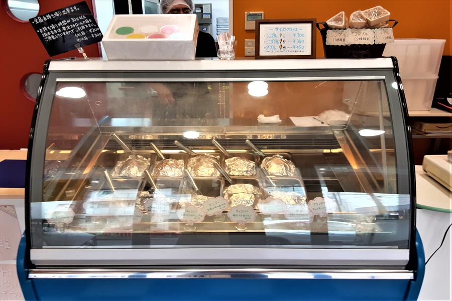 ショーケースでは、ジェラートはアルミホイルで覆われているのでどんなものか見分けがつきませんが、POPを頼りにご主人に相談してみて。