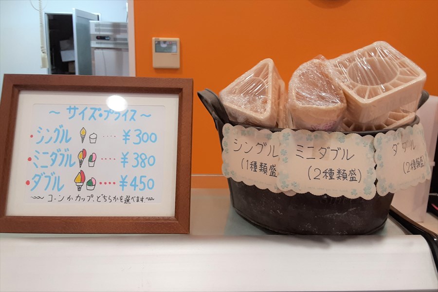 「ハッピージェラート」のジェラートは、うれしいことに明朗会計。カップ・コーンいずれもどのフレーバーでもシングルは300円、ミニダブルは380円、ダブルは450円です。これはテイクアウトでも同じ価格。