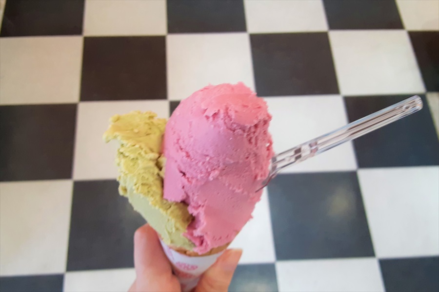 今回は「ピスタチオ」と夏季限定という「フランボワーズ」のミニダブルをコーンでいただきました。