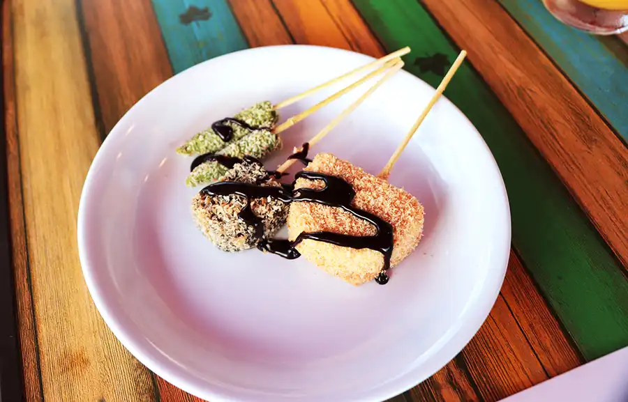 まずはタイムサービスメニューで登場する、溶岩石をイメージした真っ黒な唐揚げ「BLACK ROCK MEAT~真っ黒い唐揚げ~」は、赤いチリソースと共にいただきましょう!