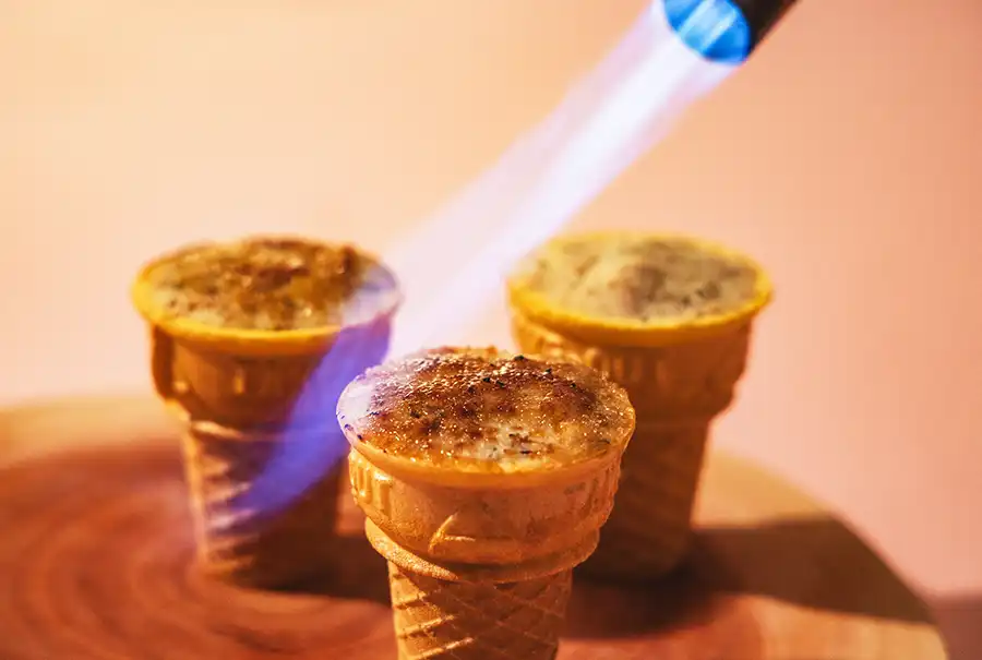 コーンカップに豚肉やマッシュポテトを詰め、表面にまぶした砂糖をバーナーで炙ってキャラメリゼする「ポークのブリュレ仕立て」は甘じょっぱさがクセになり、誰もが童心に返れる味わいです。