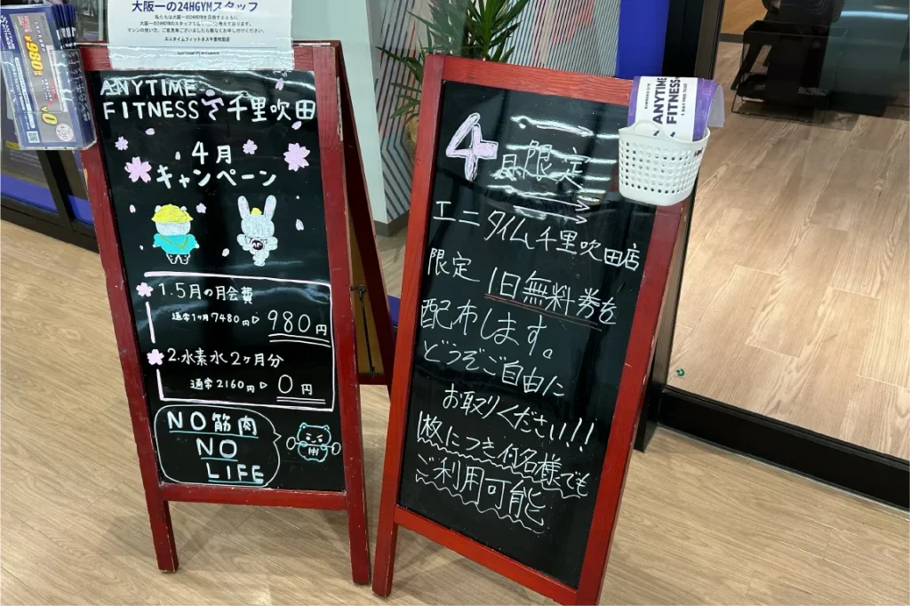 4月限定のキャンペーンとして、1日無料券を配布中。エントランス前の看板にあるため、自由にゲットすることができます。「エニタイムフィットネス」のマシンや設備を体感でき、ジムデビューを迷っている方にぴったり♪1枚につき使用人数の制限もないため、家族や友人を誘って行ってみるのもいいですね。さらに、4月中に入会すると翌月の月会費が通常7,480円のところ、980円になるといったお得な情報も!