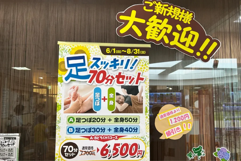 8月31日(日)まで足つぼ+全身の70分コースが通常価格より1,200円引きの6,500円でできちゃいます。日々の疲れを取り去り、リフレッシュするチャンス!興味のある方は、電話予約がおすすめです。