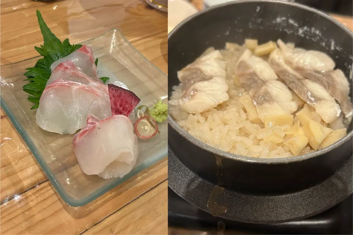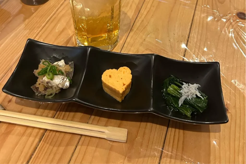 3品あるお通しは、どれも丁寧に手作りされたもの。ハート型のだし巻きが心憎いですね。お造りや釜飯など、山崎真鯛を使ったメニューも絶品で、お酒が進みます。