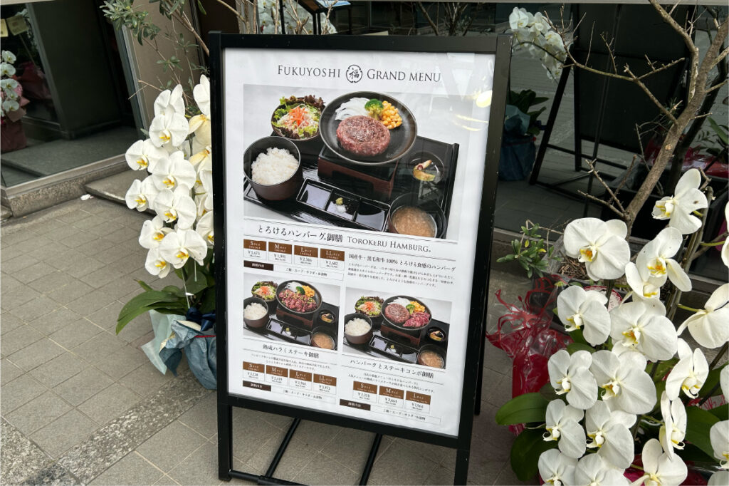 ところでこの「とろけるハンバーグ」とは?牛肉の最上級部位、シャトーブリアンに感銘を受けた「福よし」ブランドの創業者が、シャトーブリアンのような上質でとろける食感を目指して開発したハンバーグだそう。和牛のうま味を閉じ込めた上質な舌触りで、「とろけるハンバーグ」の名に偽りなし。今や国内のみならず、世界でも愛されるお味なんだそうです。