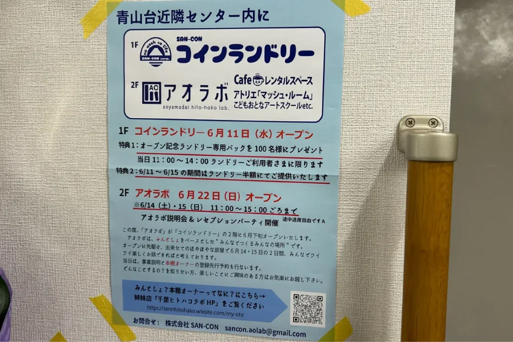 阪急北千里駅を少し歩くと、穏やかな空気が漂う「青山台近隣センター」が現れます。6月に、こちらの1階に「SAN-CONコインランドリー」、2階に多機能な交流スペース「アオラボ」がオープンしました。