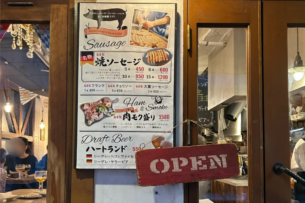 「江坂公園」の北側にあり、自家製ソーセージと樽生ハートランドのペアリングで人気のビアホール「SARU BACON 江坂本店」。行列ができることもしばしばで、肉肉しいランチでも親しまれています。