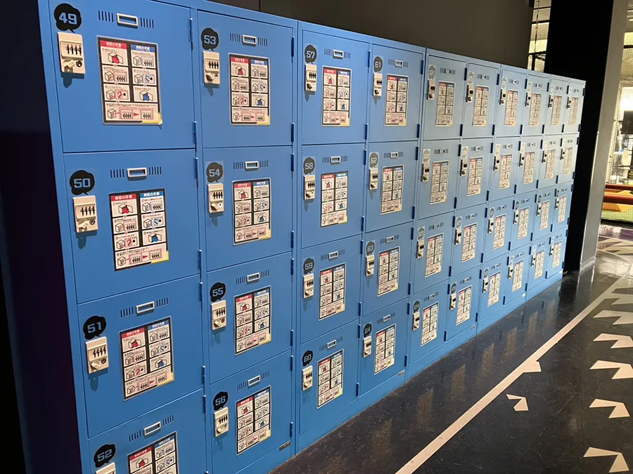 「VS PARK ららぽーとEXPOCITY店」のエントランスを入ると、中には早速アクティビティのコーナーと、廊下には無料ロッカーがずらり。