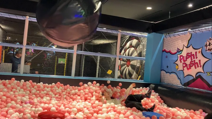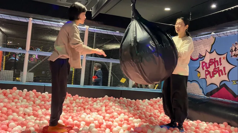 ボールプールの中央に大きなボールが吊り下げられており、ボールを挟むように足場があります。