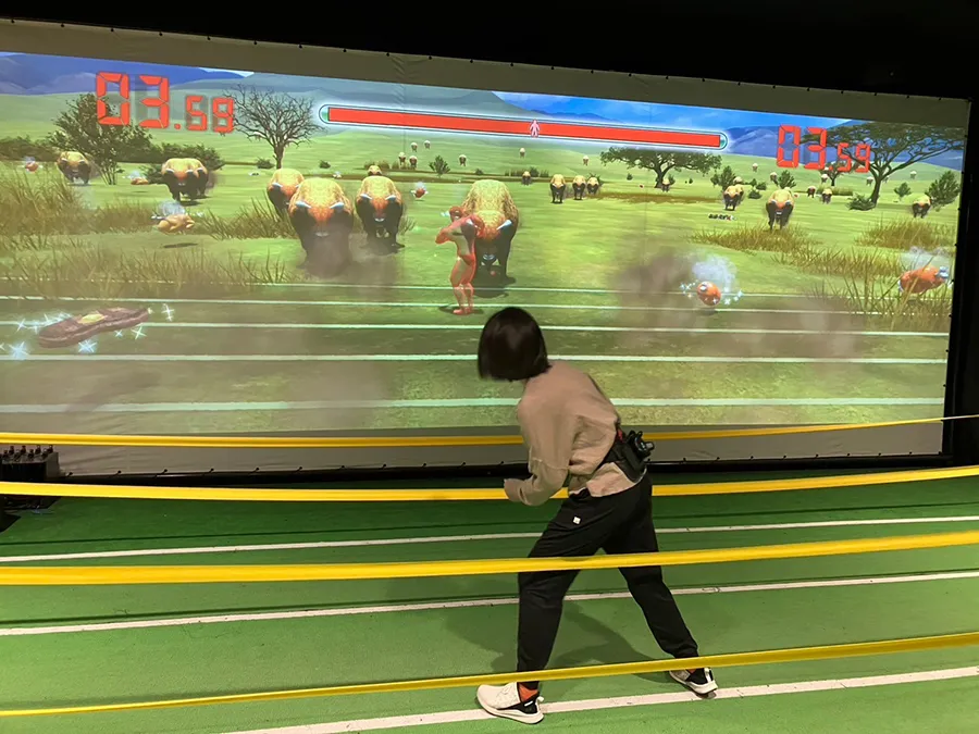 大きなスクリーンで迫りくる動物達を避けながら、お肉が来たらゲットしに行く「ヨケキル」。時間内で避け続けることができたらクリア!