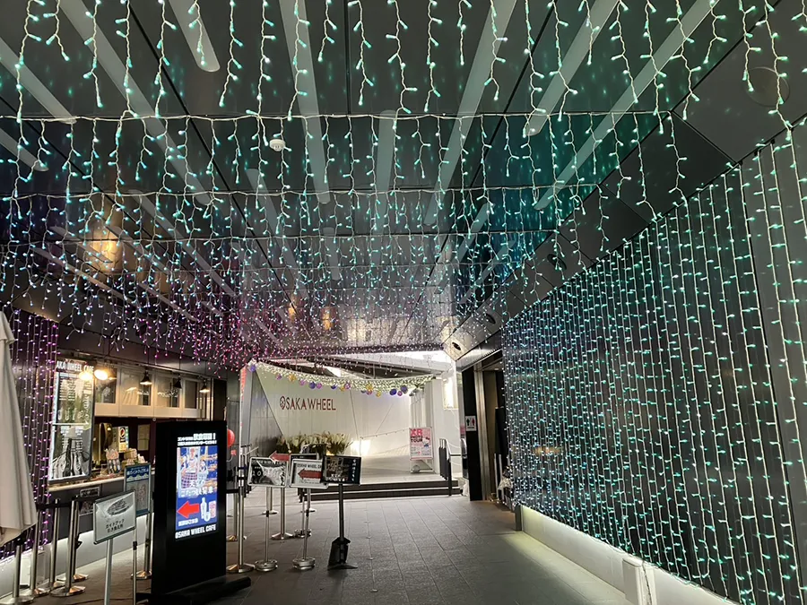 「OSAKA WHEELオオサカホイール」、実は年中様々なカラーリングのイルミネーションが施されていますが、実はイルミネーションがあるのは観覧車だけではないんです。チケット売り場からエントランスに入ると、天井や壁面一杯のキラキラとしたイルミネーションがお出迎え!