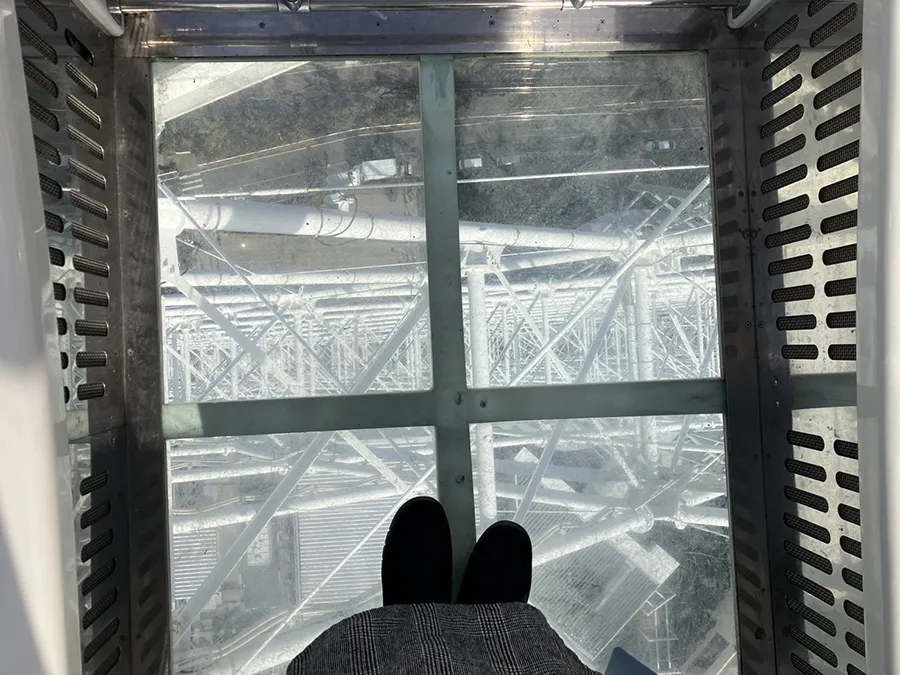 さらに床面シースルーなので、少しずつゴンドラが地面から離れて行き、高くあがっていくまでや、小さくなっていく人や車がどんどんミニチュア模型のように感じる…。そんな地上を上から覗けるのも「OSAKA WHEELオオサカホイール」ならではの醍醐味です。