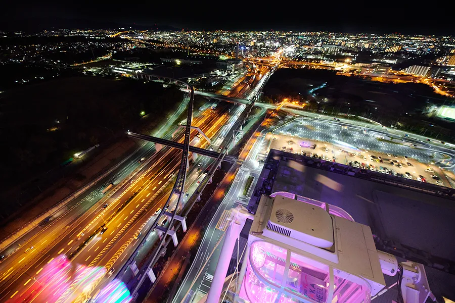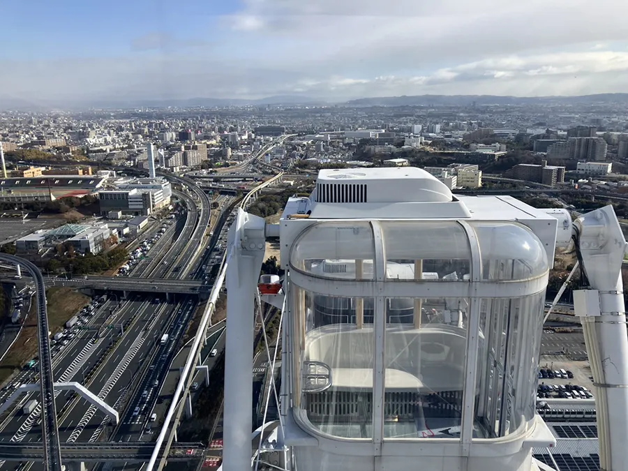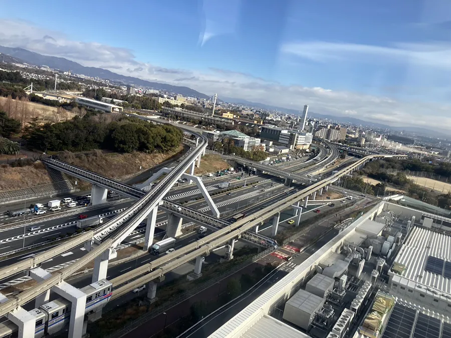「OSAKA WHEELオオサカホイール」からは、少しずつ遠く小さくなっていく大阪モノレールとその線路、そして大阪中央環状線や吹田インタージャンクション、インターチェンジを見ることができます。
