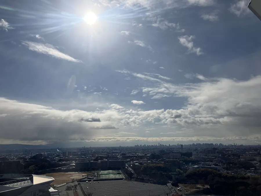 千里丘陵を越えて広がる大都会大阪の街並みと、その向こうに見える山々を眺めると爽快な気持ちになります。