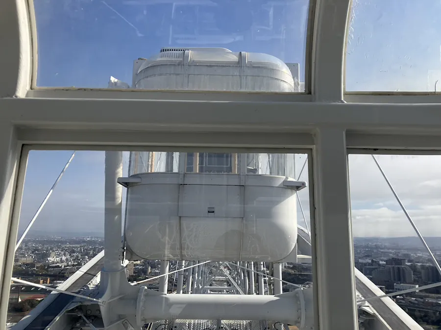 「OSAKA WHEELオオサカホイール」の楽しみは風景だけではありません。「OSAKA WHEELオオサカホイール」の魅力の一つである、シースルーの床や側面のゴンドラ。そこから見える、観覧車の骨組みの規則正しい構造が美しく、そこが1つめのおすすめの撮影スポット。