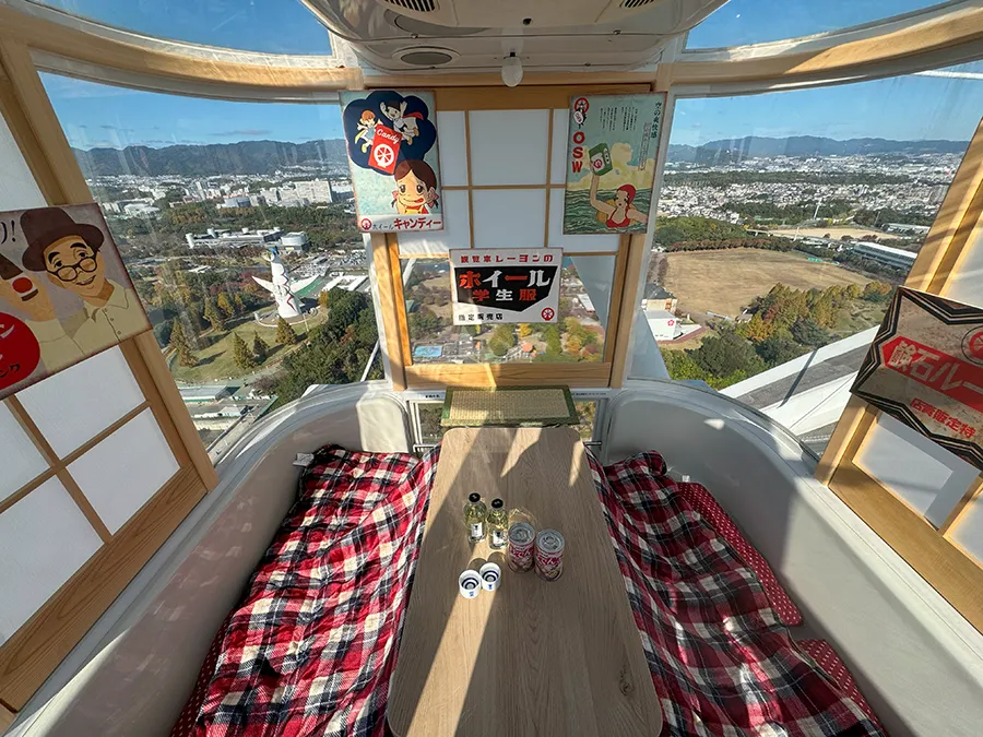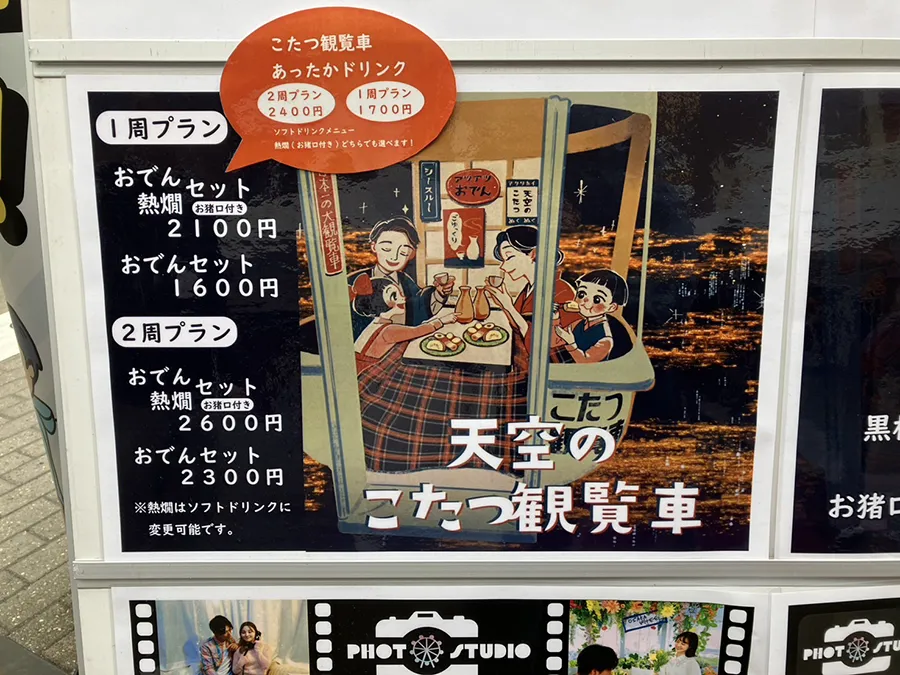そして今回取材時の冬のシーズンゴンドラは、半纏を着てゴンドラ内でこたつとおでん、熱燗を楽しめるこたつ観覧車がありました!