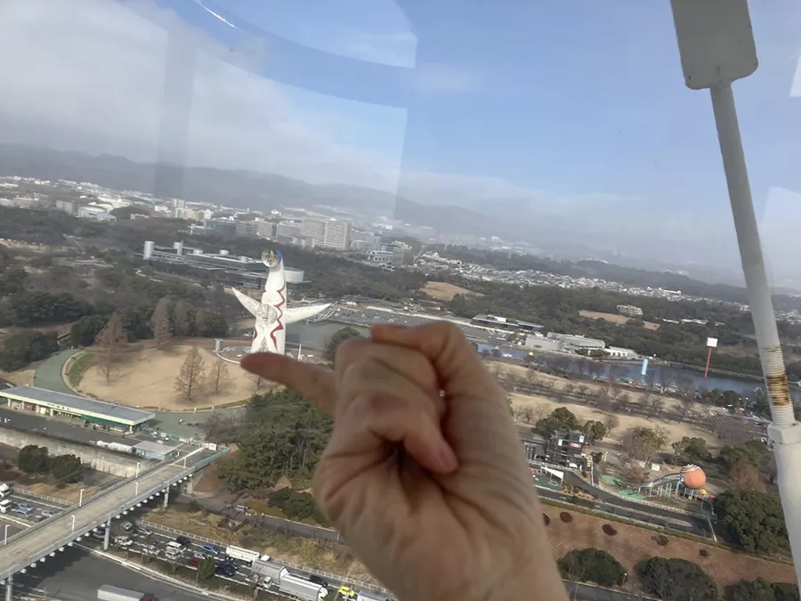 まずは、時計の9時くらいの位置にゴンドラが差し掛かった時に撮影したいポイントが太陽の塔! 万博記念公園の方を見ると、太陽の塔が上からちょうど見下ろせる場所になります。「とてもかわいい写真が撮れますよ!」と三輪さん。