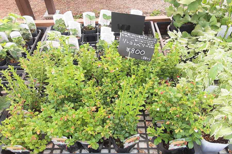 「リンゴンベリー」800円などのリーフ類や樹木苗などもラインアップ。