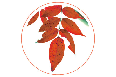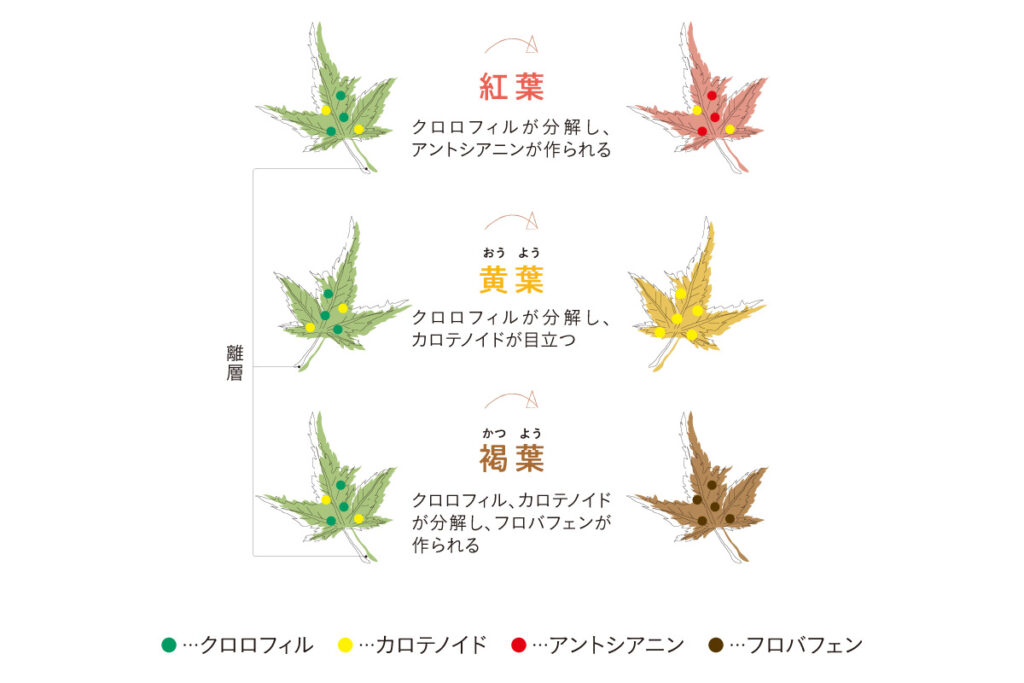 植物の葉には、元々ルテインやカロテンなど黄の色素となるカロテノイドも含まれるが、緑色に見えているのは、葉緑体(光合成を行う植物の器官)の中に含まれるクロロフィルが多いから。「紅葉は葉緑体を保護するためと考えられていて、元々どの色になる葉にもカロテノイドやタンニン、クロロゲン酸などは含まれています。この量によっては、本来紅葉する葉もアントシアニンの生成が少なくて、褐葉になることもあるんですよ」と中井さん。