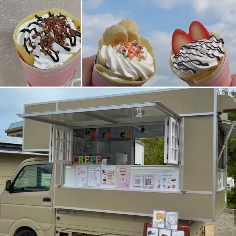 おやつには三台のキッチンカーがどこも魅力的。「ル シュクレ」ではモチッとした生地でたっぷりクリームを包んで可愛らしくトッピング。食べ応えのあるクレープが楽しめます。