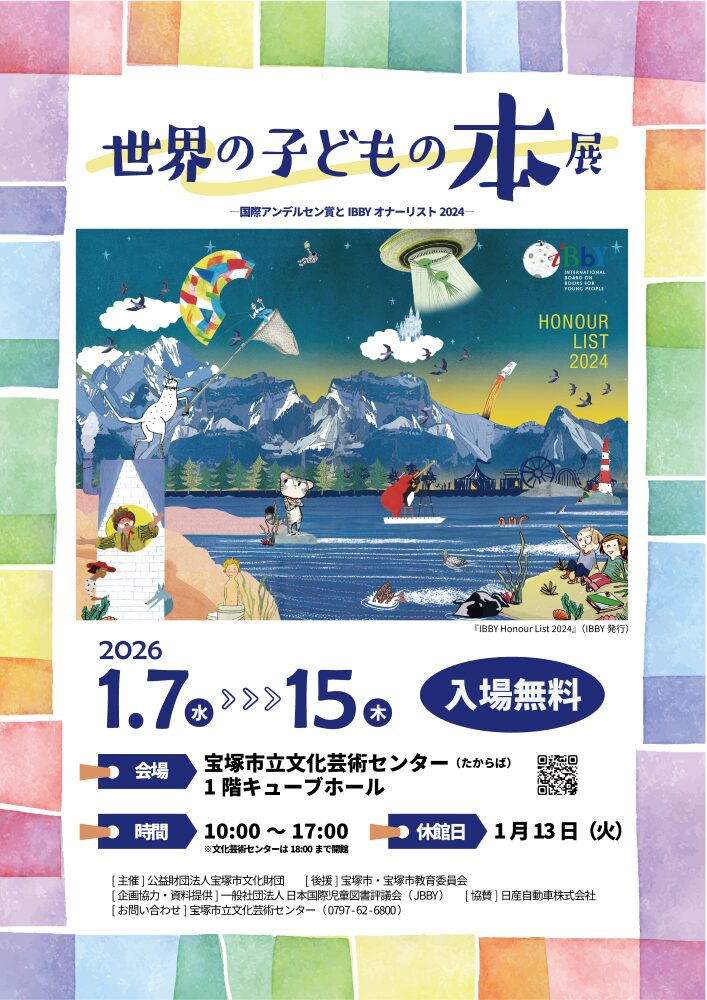 1月7日(水)から1月15日(木)には、1階のエントランスから入ったところ、キューブホールにて「世界の子どもの本展」を開催。国際児童書賞「国際アンデルセン賞」と、国際児童図書評議会(IBBY)が発行している児童書の「IBBYオナーリスト」に選ばれた絵本をずらりと展示します。IBBYとは1953年に創設された「国際児童図書評議会」の略。「子どもの本を通した国際理解」を使命に、子どもの本の普及や識字率向上のための活動、被災地や戦下の子どもを支援する活動をおこなっています。宝塚で「IBBYオナーリスト」に選ばれた絵本を展示するのは、今回が初めての試みとあってひそかに注目が集まっています。