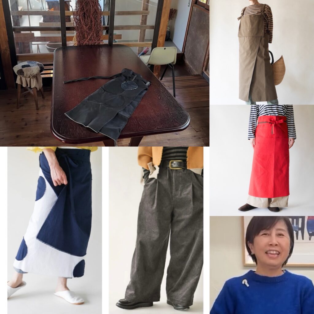 ただいま開催中の企画展「yumizuの大忘年会」(~12月28日(日))は多くのファンが待ち構えていた、今年最後を飾る企画展です。豊中にあるアトリエ「yumizu」は、まえかけが有名。まえかけ=エプロンの和名と安直に考えがちですが「yumizu」のまえかけは色やデザインの美しさからファッションのひとつ、といえます。機能性も抜群で、魚屋さんが着用する胸まであるロングサイズが原型ですが、畳んでカフェのギャルソンエプロン丈にも魚河岸の前掛け丈にもなるのです!しかもリペア対応もしてくれるというのだから、一生ものです。今回の企画展では「yumizu」のまえかけやワイドパンツのオーダー販売をはじめ、「yumizu」の作家・坂田真由美さんがつながりのある、仲の良いアーティストに声をかけて集めたものを紹介しているのです。