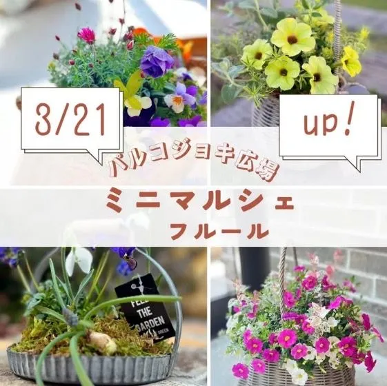 21日だけのイベントとしては、フルールの田村優子先生によるミニ寄せ植え教室を開催。春らしいかわいい作品作りを楽しみましょう。参加費3,500円。予約がベター(予約は電話かSNSのDMにて受付)。