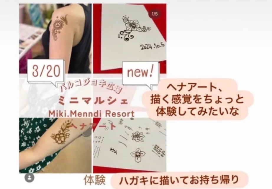 20日だけのイベントとして「ヘナアートのワークショップ」を開催。自分でヘナアートを描く体験コースでは、ハガキ1枚に好きなように描けます。1,500円。