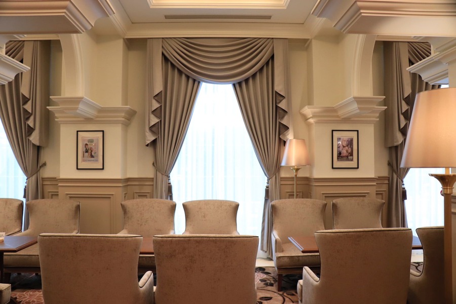 ホテルのロビーからつながるラウンジは、ホテル全体のクラシックで上品な雰囲気がそのまま生かされています。店内からは、ロビー中央の赤絨毯が敷かれた階段や、期間限定で展示されている宝塚歌劇トップスターの展示コーナーも見えます。