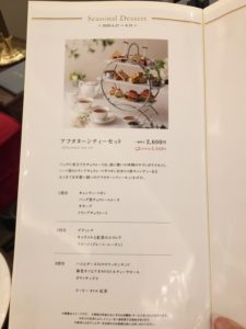 席に案内されたら、いよいよメニューの注文です。周りを見渡すと、半数くらいの方がアフタヌーンティーを注文されていて、人気ぶりが伺えます。