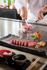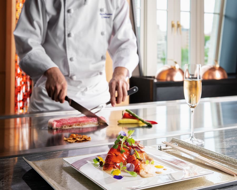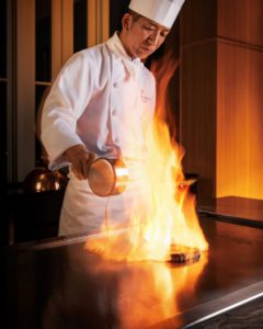 鉄板焼「風雅」は、店内奥の鉄板カウンターがずらりと並ぶエリア。