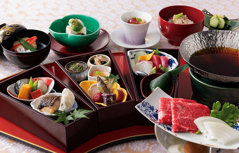 ホテルおすすめのランチ限定「昼顔点心 すみれ」は、造りや和え物、焼き物など9品を盛り合わせた扇形の三段重に、牛肉すき焼きなどがコースになっています。彩り豊かで、目でも楽しませてくれます。