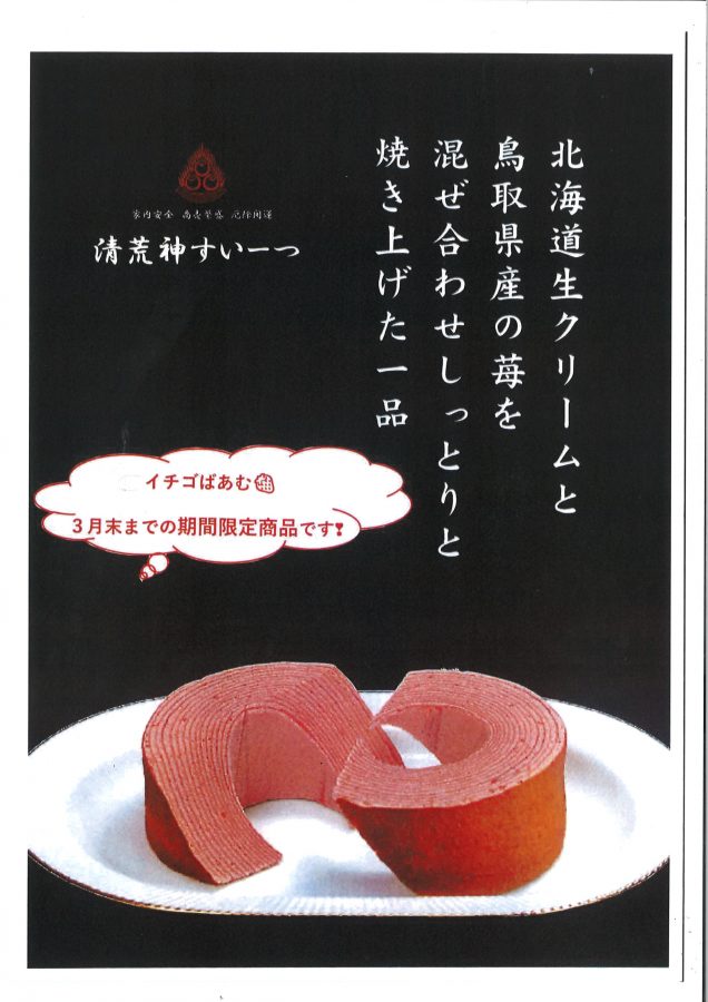 荒神ばうむに加えて、4か月ごとに変化球系のバウムクーヘンが加わります。小豆味、抹茶味、イチゴ味の三種類。12月から3月いっぱい販売されるイチゴばうむ1,000円は、ピンクの色も可愛らしくて人気があります。北海道産の生クリームと鳥取県産のイチゴを混ぜ合わせ、しっとり焼きあげた贅沢なバウムクーヘンです。12月27日(土)28日(日)の納荒神や初詣の際のお土産にぜひお買い求めください。または今年はイチゴの価格が高騰していているので、イチゴばうむにホイップを飾ってクリスマスケーキに仕上げるのもいいですね。