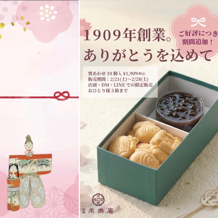 この寳あわせ、2月21日から2月28日まで、創業1909年にちなみ10個入りを税込みで1,909円(通常は税込み2,100円)で販売されます。2月の前半に打ち出したところ好評につき、追加販売です。1人3箱まで。今の時期、ひなまつりの熨斗紙が用意されています。桃の節句のおみやげなどに喜ばれそうです。