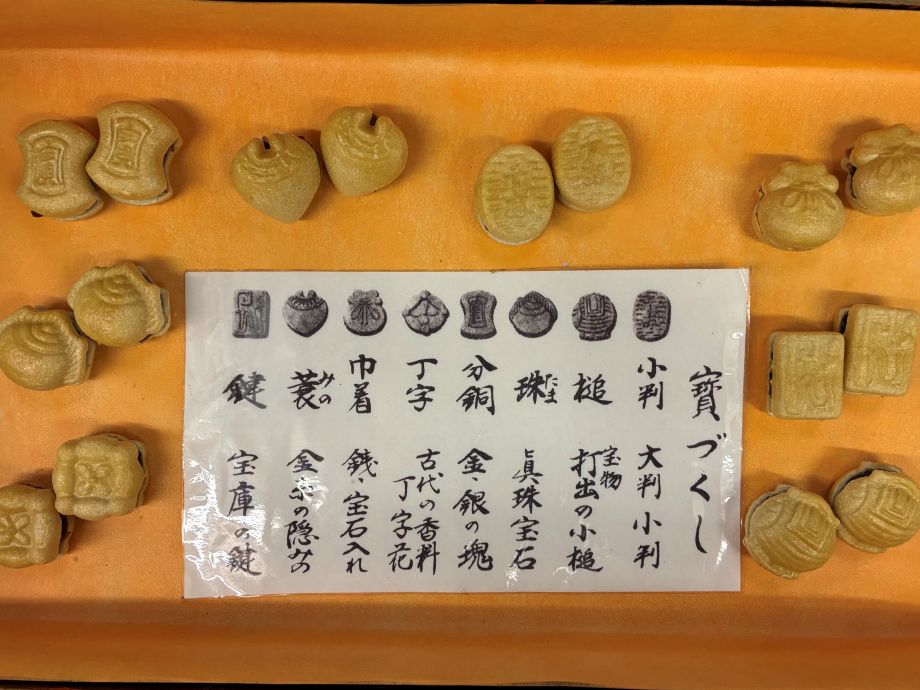 そんな歴史話をしてくれたのは、四代目の松尾道子さん。「おじいちゃんの時はもう少し小さかった」そうですが、寳もなかの8種の鋳型のデザインは当時のまま。中国の吉祥思想に由来するようで、打出の小槌や宝庫の鍵など、宝尽くし文様です。七宝に小判を加えたのは「おじいちゃんのアイデアです。8種類あるので詰め合わせを作るのも面倒だと思ったりすることもありますが、手作業でしっかり確認しながら商品をお渡しするのは安心につながりますね」と道子さん。