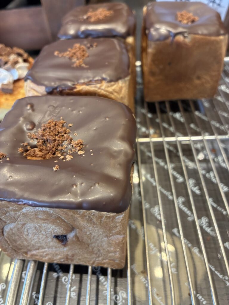 ショコラ・オランジェはクロワッサン生地に焼きチョコ、オレンジダイス、ホイップ、生チョコとチョコレートまみれ。生チョコキューブも生チョコやチョコチップを巻いて焼きあげたキューブ型のパンにチョコ掛けしてあってチョコクランチトッピングというチョコ祭り。どちらもバレンタインにド直球なパンですね。