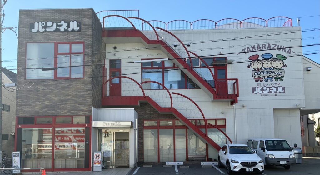宝塚っ子は、パンネルで育つと言っても過言でないとも言われますよね。宝塚にはハード系、総菜系、フレンチ系などたくさんの美味しいベーカリーが存在しますが、食卓で一番親しまれているといえばパンネルなのかもしれません。新年初めての宝塚取材で、しめ縄が飾られている「パンネル宝塚総本店 一麦館」にパンを買いに行きました。道を隔ててお店を望むと、改めて、キャラクターの三人の妖精のかわいらしいこと。そして外階段の赤いアーチ型の装飾が、山食の山に見えてきました。