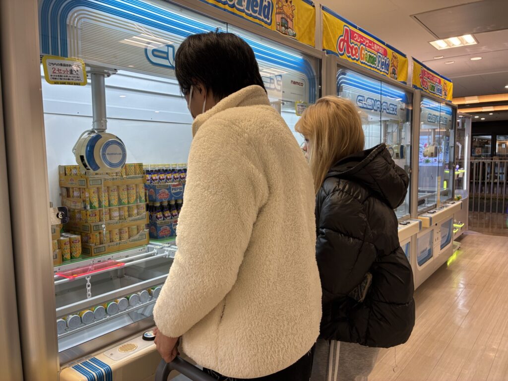 平日の午前だったので空いている店内で、カートをひいてゲームに挑むカップルを発見。調子を聞くと「簡単に取れるのでよく来ます。日用品を狙ってます」と言います。カートを覗くとボックスティッシュにジュースの山。二人ともクレーンゲームが好きなので多い時は1万円近く使いますが損をしたことはないそうです。スタッフによれば、やはり食品のクレーンゲームが人気だそうで、一番人気は「マネケンのワッフルの箱」。確かに、1,000円以上のものを1回で落とせたら、小躍りしそうですね。
