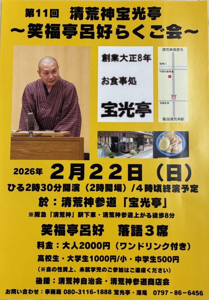 清荒神の参道を歩いていると、「宝光亭」で開催される「笑福亭呂好(ろこう)らくご会」のポスターをよく目にしました。
