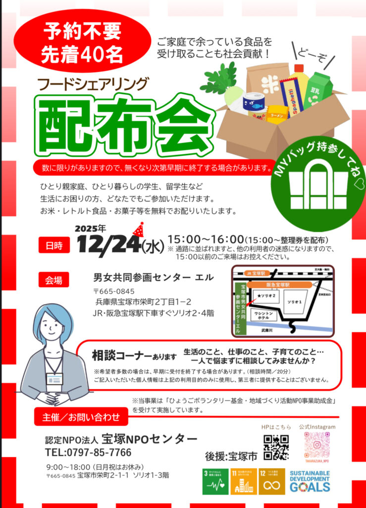 今回、回収された食品は12月24日(水)15:00からソリオ2の4階にある宝塚市立男女共同参画センター エルにて配布されます。限定40名に配布予定で整理券が15:00より配布されます。