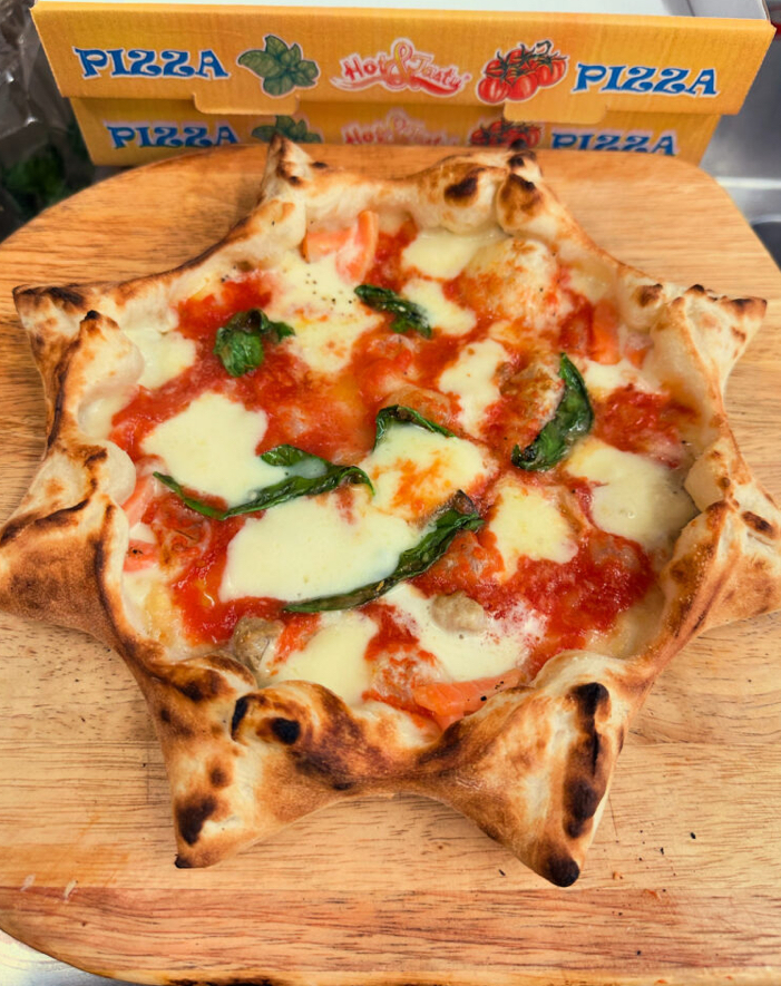 ↑ 生地に切り込みを8か所入れてつまんで作る星形ピザ「STO」。真ん中がマルゲリータで星の角には自家製サルシッチャ(ソーセージのこと)とサーモンが交互に入っていて、1枚で3つの味わい!