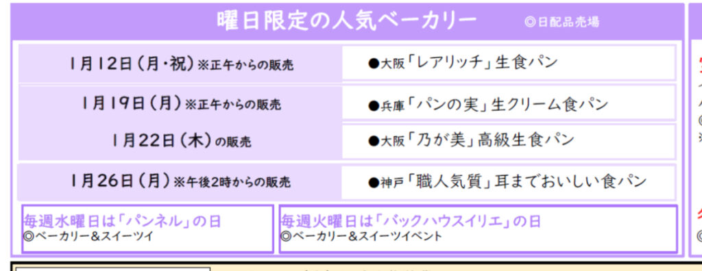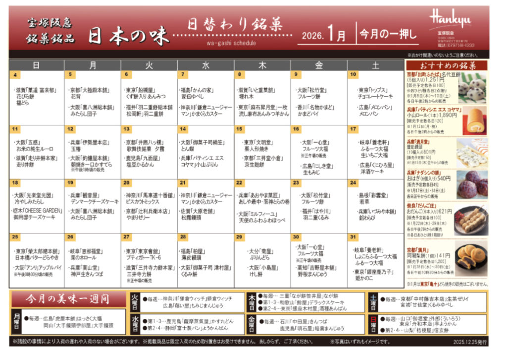 百貨店はデパ地下巡りが一番、心躍るという人には宝塚阪急はぴったりですよね。駅舎から続く二階のフロアのみという狭い百貨店ですが、そのフロアの大半が食品。しかも、グルメな宝塚市民が飽きないようにと、食品の催事がほぼ毎日ありますし、日替わりで全国各地の銘菓やグルメがやってきます。改めてそのスケジュール表を見て、羨ましい限り。