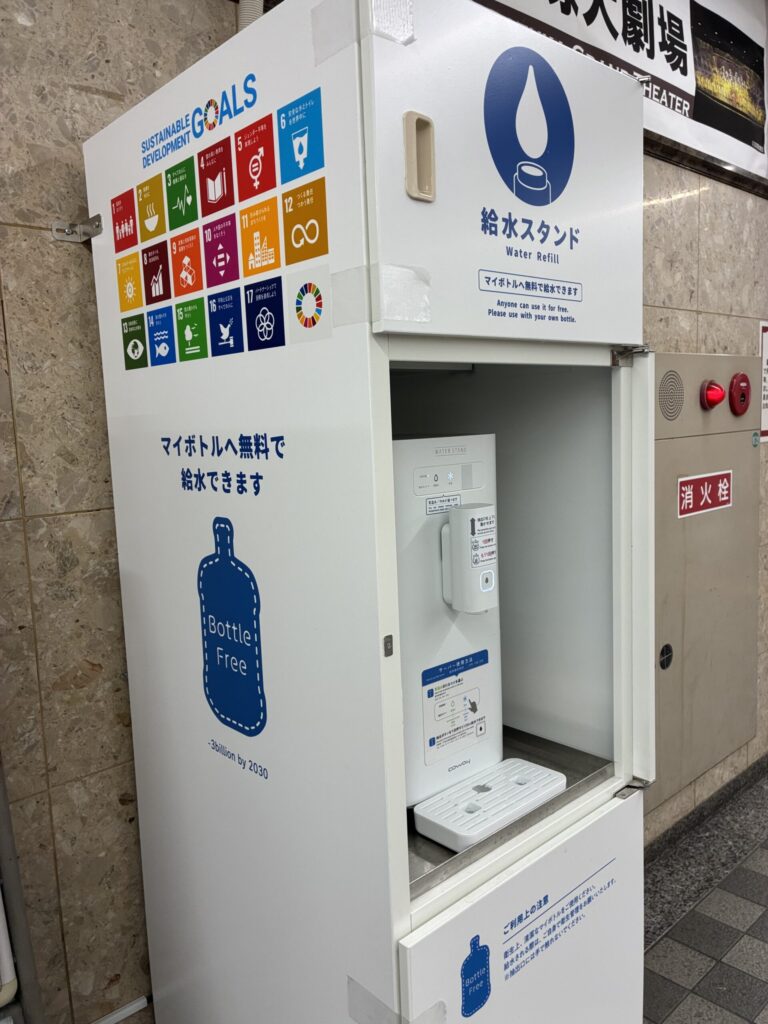 無料で、しかもマイボトルでも給水ができる給水スタンドを初めて見たのは無印良品でした。ペットボトルの削減につながるというSDGsなシステムに感激したものです。阪急電鉄では’22年の秋に西宮北口駅、園田駅、岡町駅、北千里駅という四つの駅にマイボトル専用の給水機を設置し、二か月間の利用者の様子を検証。検証期間では1日平均、4駅の合計で139.6L利用されたとか。年間ペットボトル933,242本相当の給水を見込めるという期待とマイボトル持参の推奨になるという判断から、その後も引き続き、スタンドを置いています。他の駅にもあれば便利だなぁと思っていたら、12月1日に阪急宝塚駅の構内にもできましたよ!改札を抜けてトイレのほうに進めば、左の壁沿いにほら。