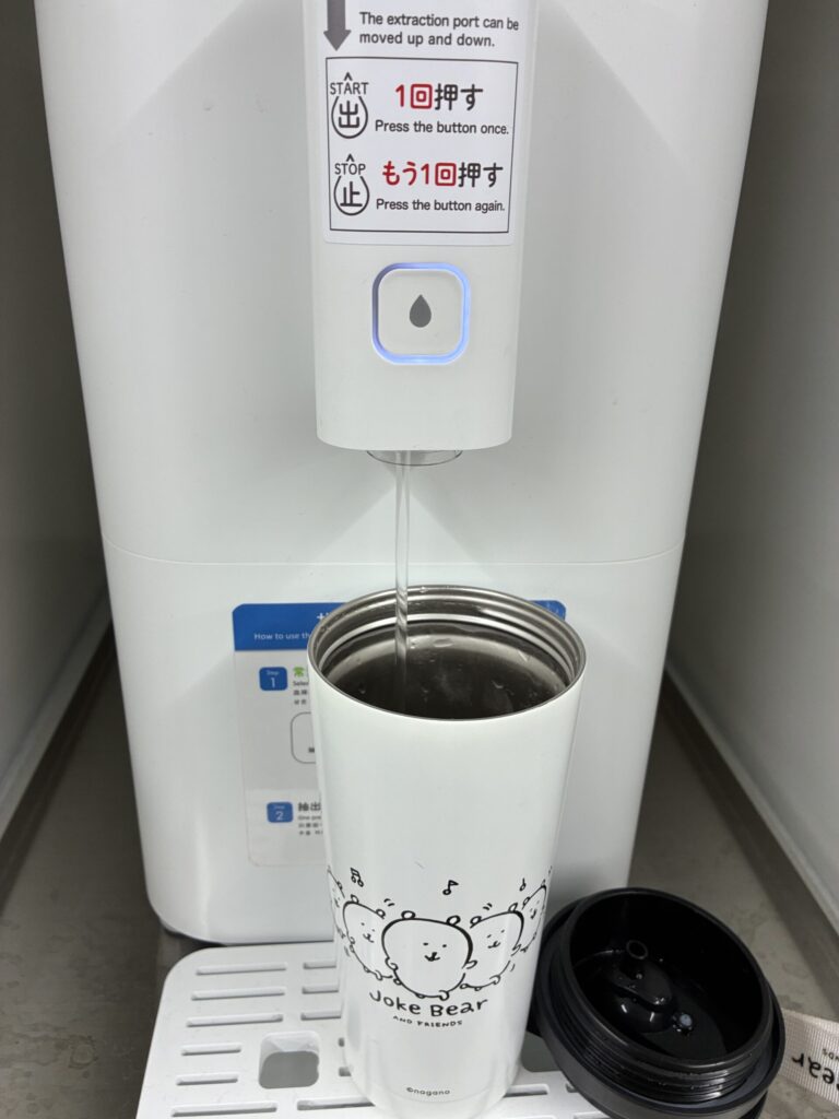 誰もいなかったので、まだあまり認知されていないのだろうか、と思いながら持参のマイボトルを取り出しました。給水口のところに置いて、まず冷水か常温水かのボタンを選択。私は常温にしました。そしてしずく型が描かれ、光っているボタンを押します。一度押せば出て、止めたい時にもう一度押せばいいだけ。