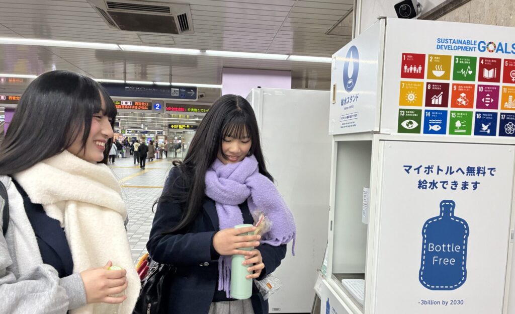 ぎこちない手つきで給水していると、後ろに女子高生がふたり。マイボトルを片手に並びました。聞くと、よく活用しているのだそう。「冬だから常温で飲んでいます。美味しいですよ」と手際よく水を汲んだ後、ホームへ元気に駆けあがっていきました。その後、サラリーマン、男子学生、、、電車の乗降の前後にみなさんスマートに使いこなしていました。