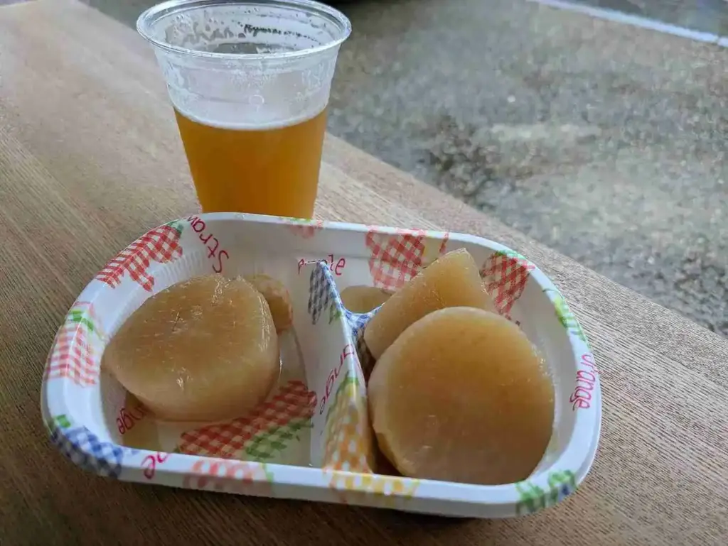 味がしみ込んだ地元産の大根炊きもふるまっていただきました。これがまたビールに合う!ご近所の常連の方とお話をさせていただきながらグビグビ。