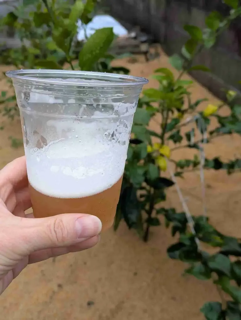 そのビールの名は、「高槻清水っ粉クラフトレモンビール」。販売会場で飲むことができるということで、早速ワクワクしながらカップに注ぎ入れます。