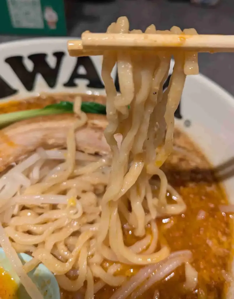 濃厚なスープがしっかりと絡む、もちもち食感のちぢれ麵