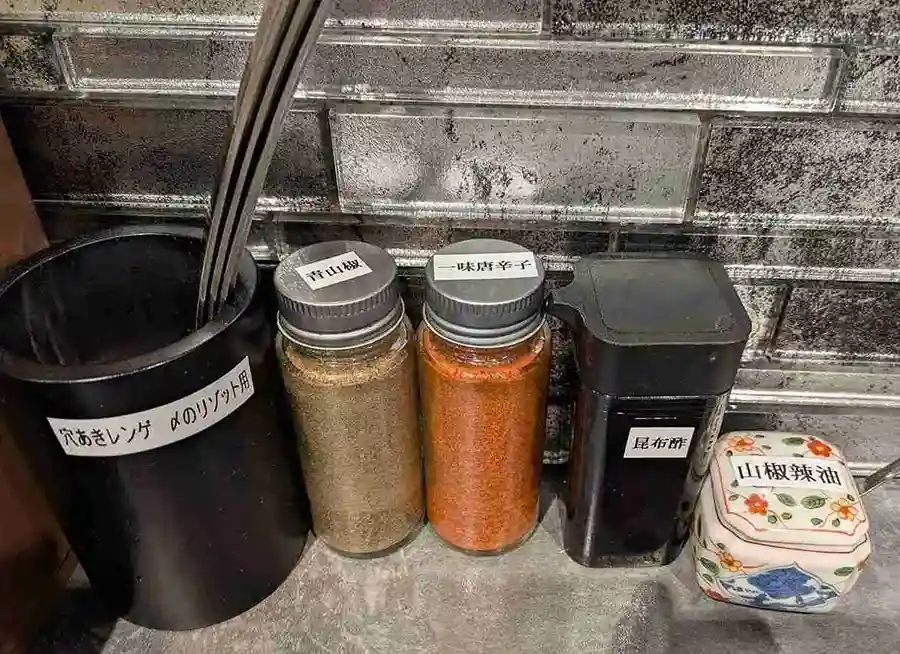 卓上には青山椒、一味唐辛子、昆布酢、山椒辣油といった味変アイテムがラインアップ。シビカラどちらも普通レベルの3をチョイスしましたが、シビカラ好きの私にとってはまだレベルアップできそうだったので、青山椒でシビれ、一味でカラさをプラス。